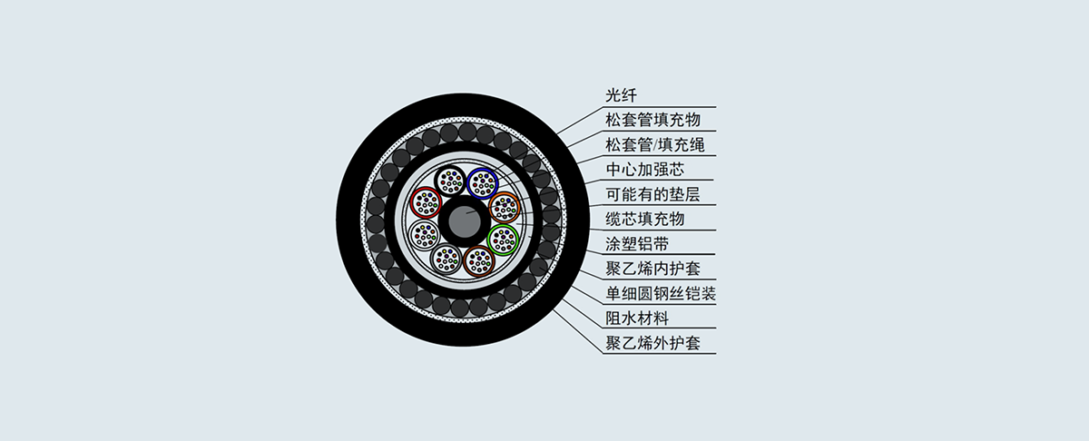 GYTA33光纜的結構是將單模或多模光纖套入由高模量的聚酯材料做成的松套管中,套管內填充防水化合物。纜芯的中心是一根金屬加強芯,對于某些芯數的光纜來說,中心加強芯外還需擠上一層聚乙 烯(PE )。松套管(和填充繩)圍繞中心加強芯絞合成緊湊的圓形纜芯。纜芯內的縫隙充以阻水填充物。涂塑鋁(APL)縱包后擠一層聚乙烯內護套,再經單層細圓鋼絲鎧裝后,最終擠制聚乙烯外護層成纜。